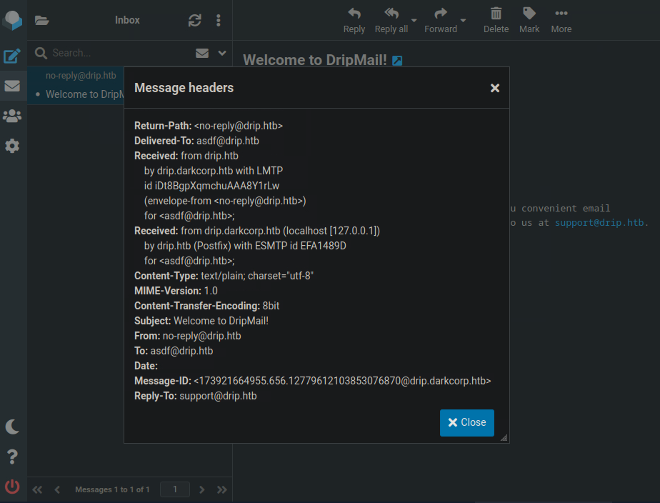 Welcome to DripMail! We're excited to provide you with convenient email solutions! If you need help, please reach out to us at support@drip.htb.