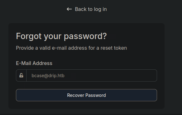 You can access the dashboard at `dev-a3f1-01.drip.htb`. Please note that you'll `need to reset your password` before logging in.